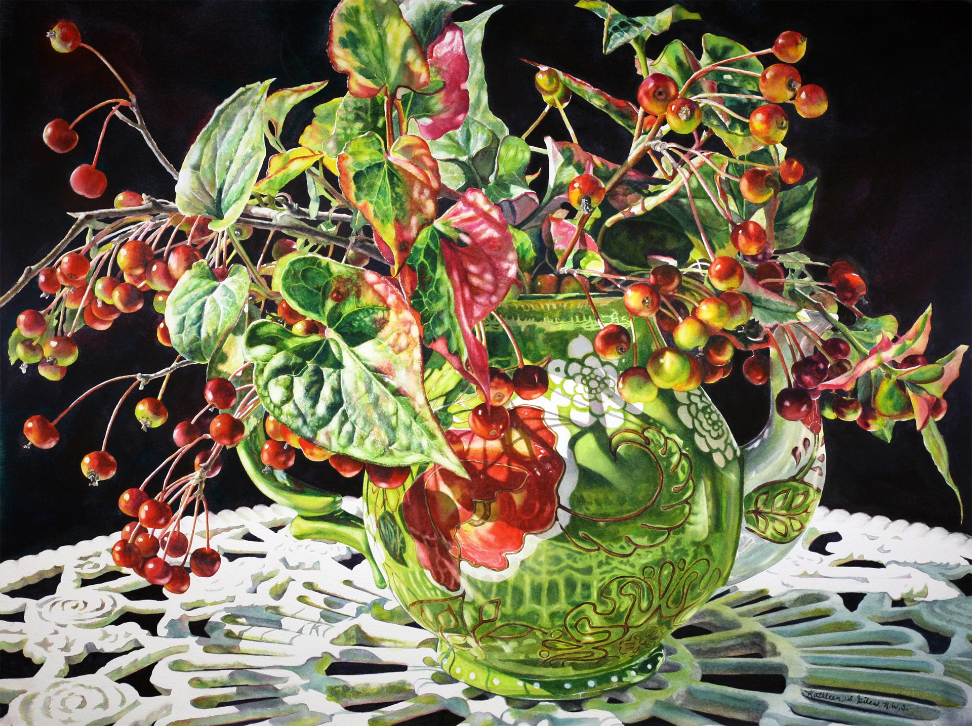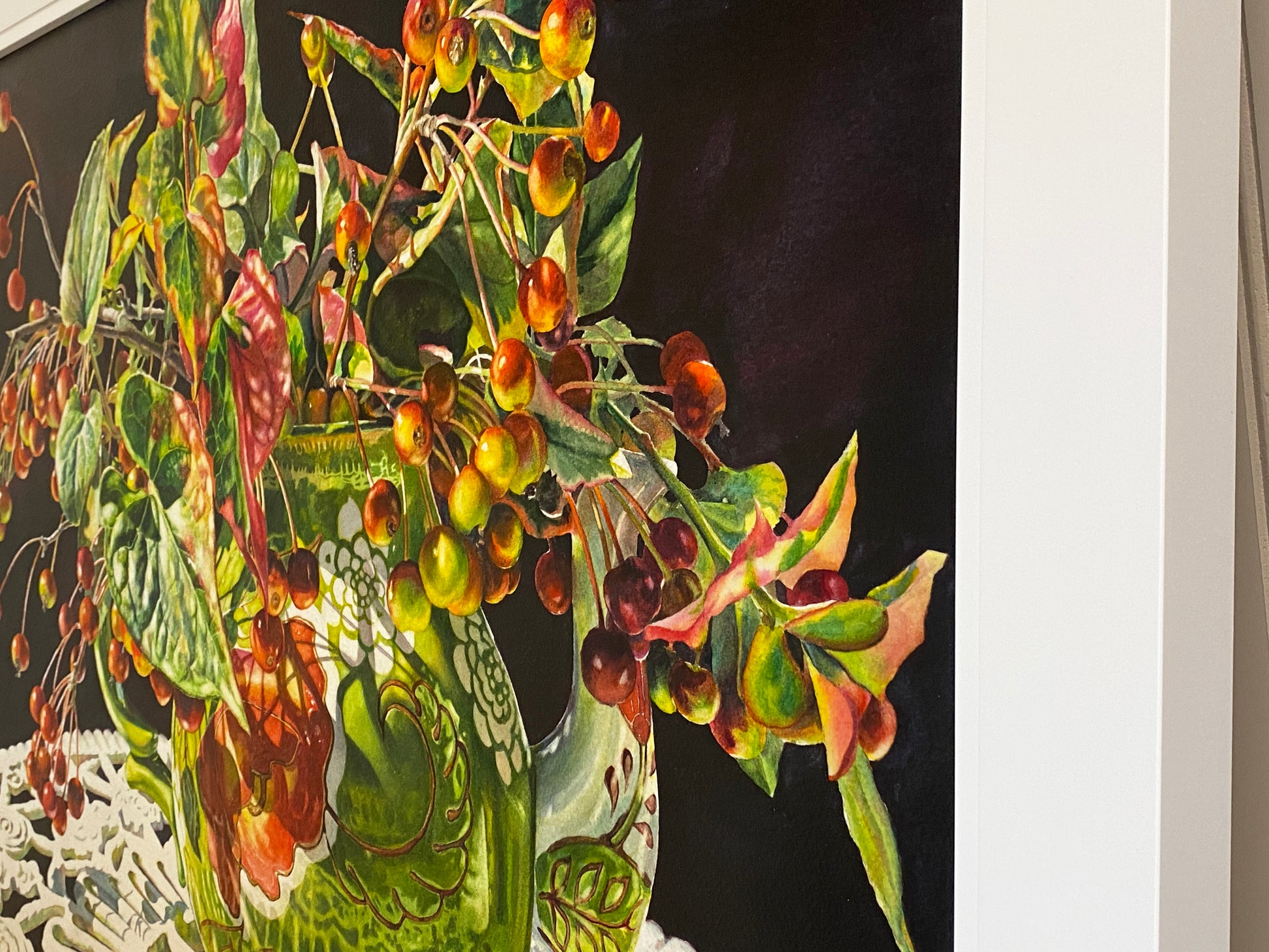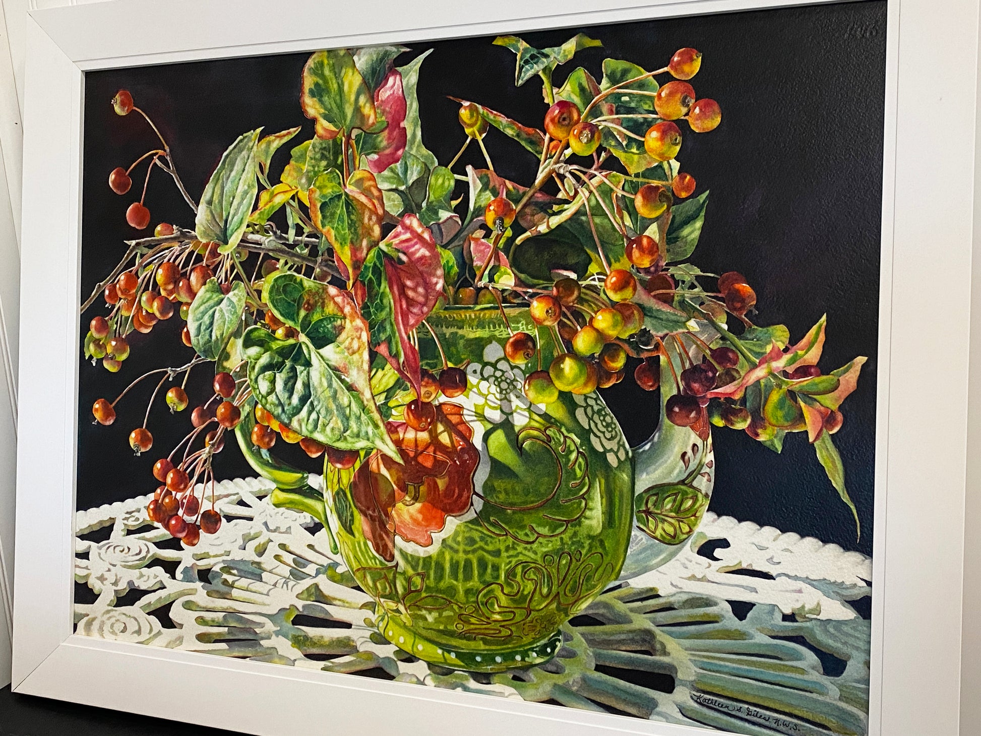 Original Watercolor painting on watercolor paper, mounted to board and varnished. This painting took almost a month of work. In person, the crab apples look very real. It is framed in a white wood moulding.